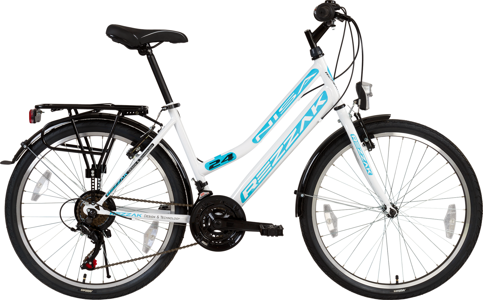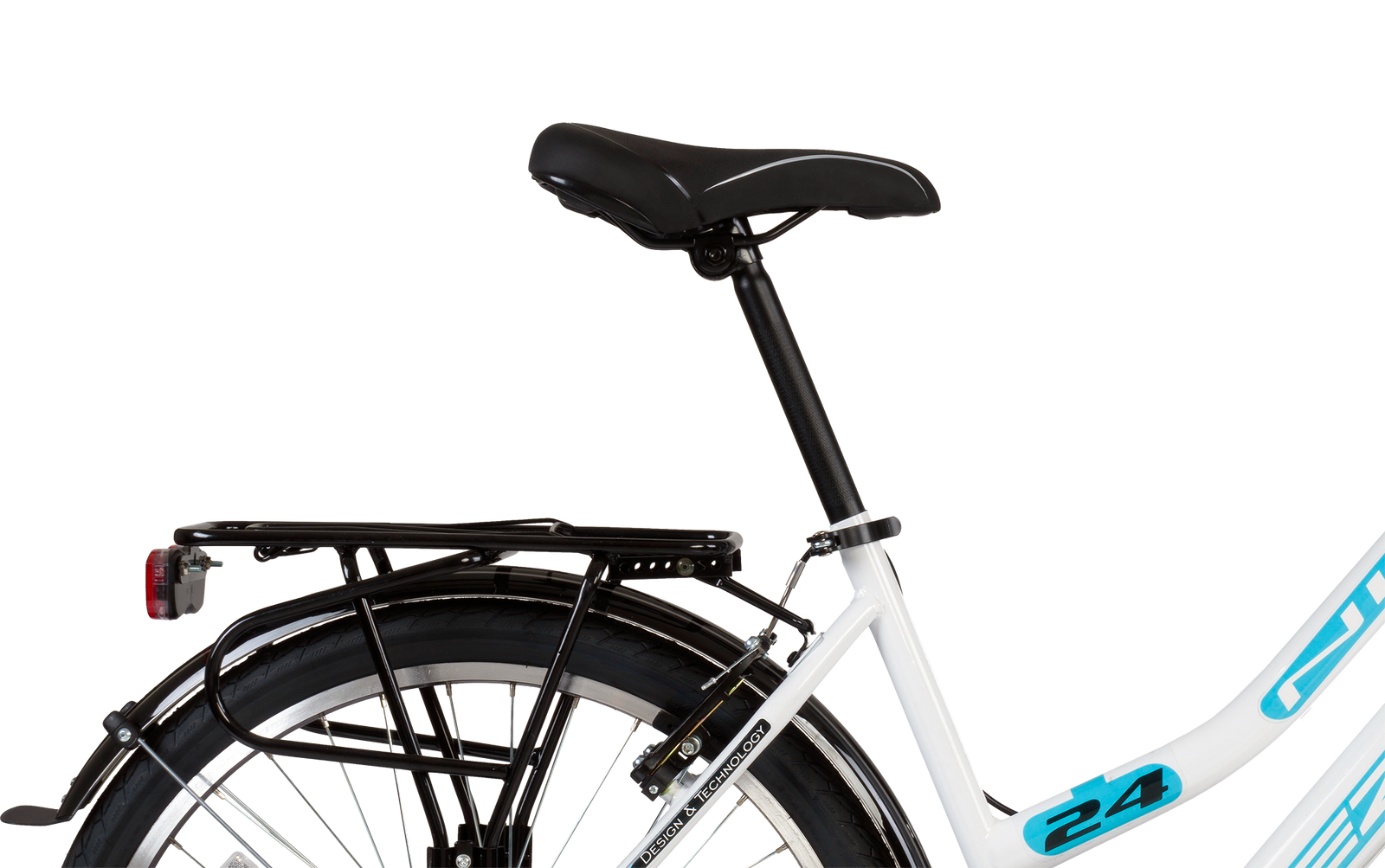 Produktbeschreibung für ein 24-Zoll Mädchen-Cityfahrrad (Weiß/Türkis) mit 21-Gang Shimano-Schaltung.